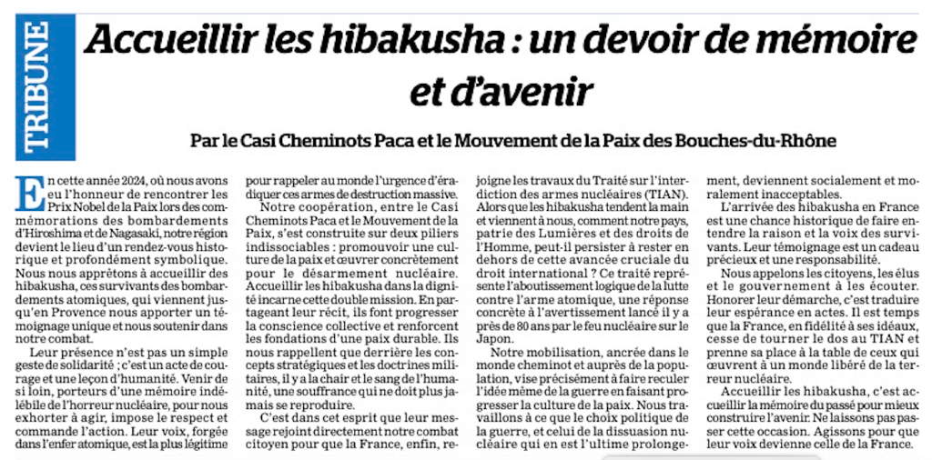 Accueillons ensemble dans un grand Tour de France de la paix, nos amis japonais Prix Nobel de la paix 2024.