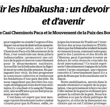 En Mai et en novembre, dans les quartiers, les écoles, les entreprises, les centres sociaux, les villages recevons les témoignages des Hibakushas et renforçons la Paix et la solidarité entre les peuples.